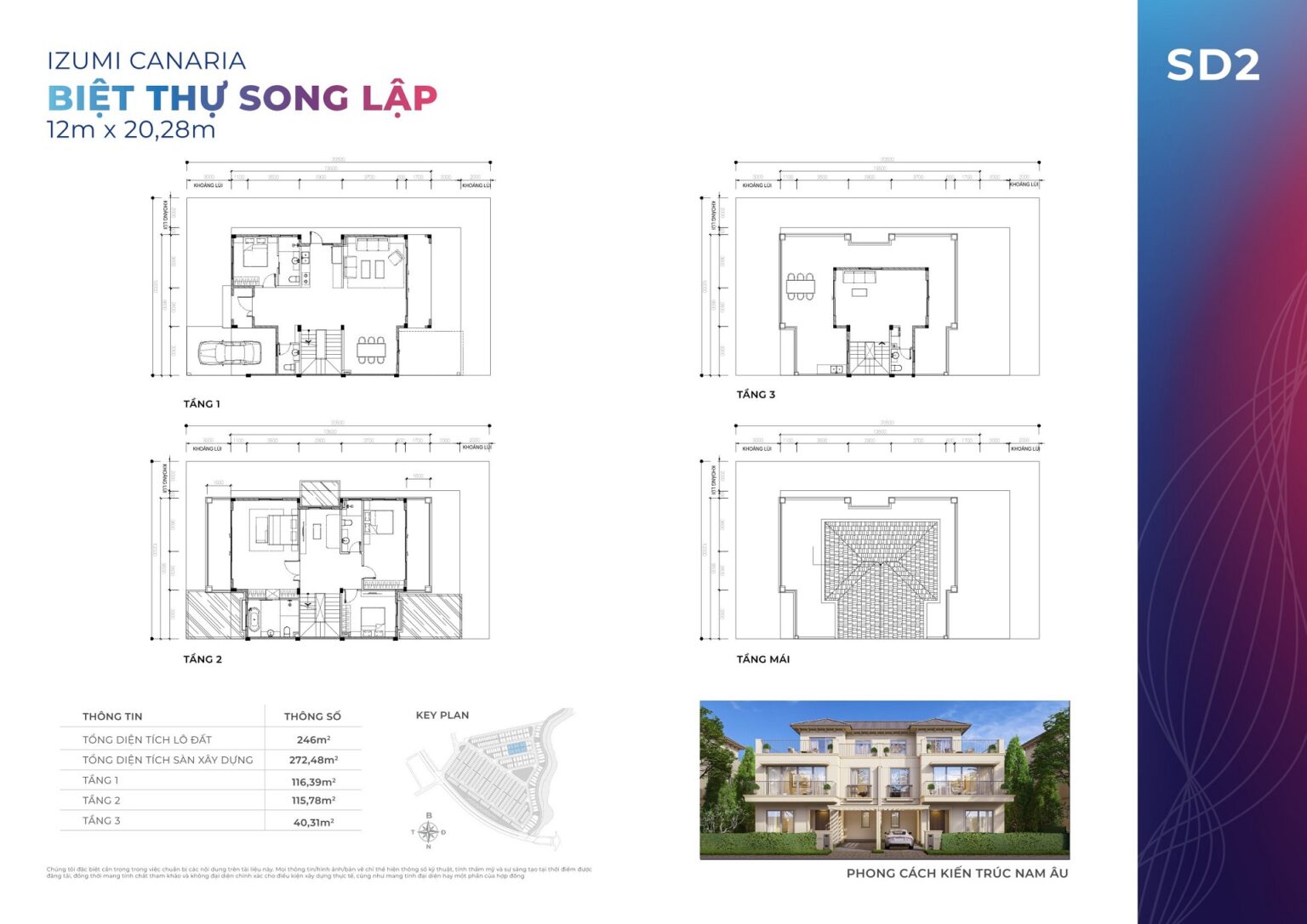 ● Biệt thự song lập Canaria 12m ngang: 12m x 19,5m, 272 m2 sàn, 3 tầng.