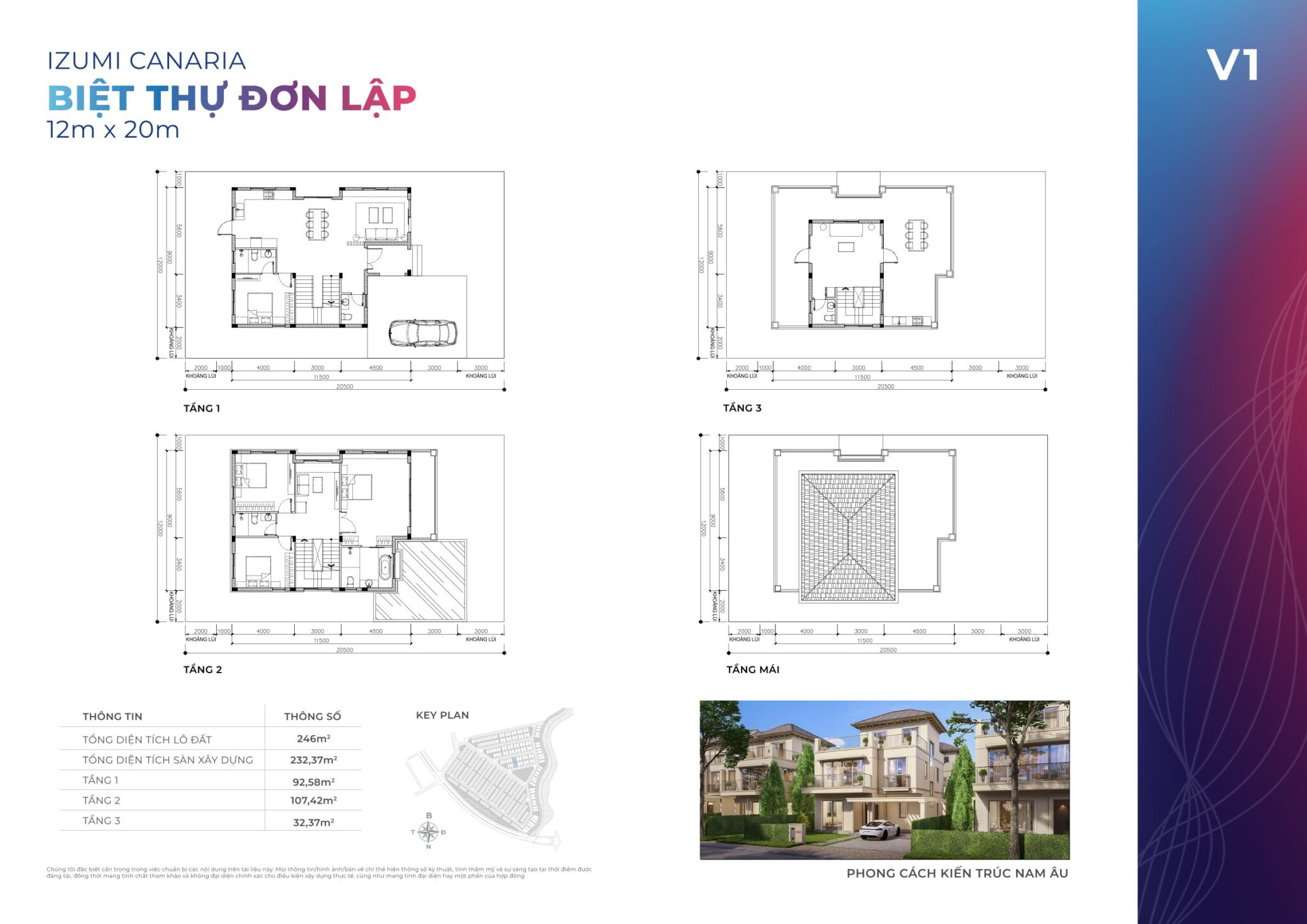● Biệt thự đơn lập Canaria 12m ngang: 232 m2 sàn, 3 tầng.