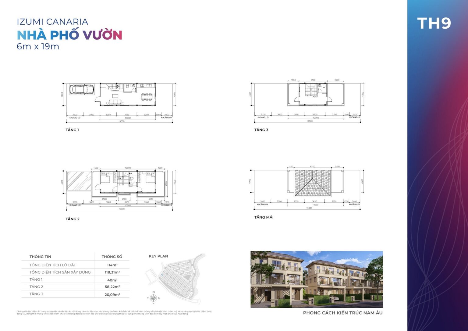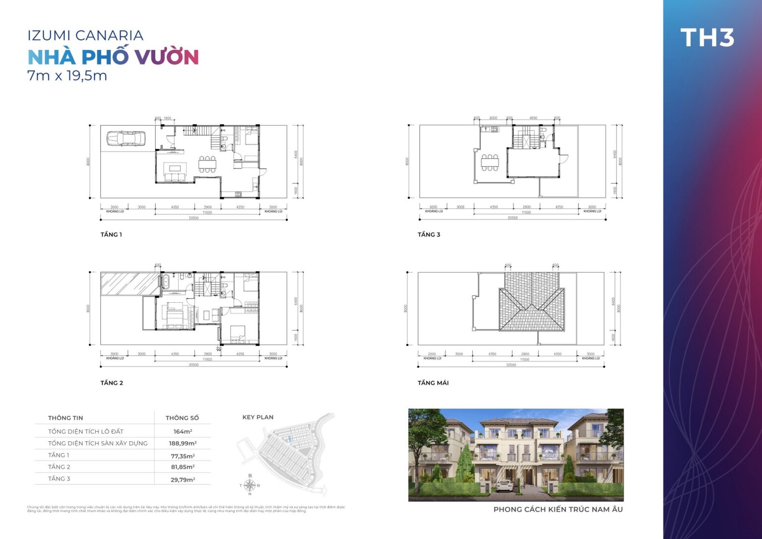 ● Nhà vườn Canaria 7m ngang: 7m x 19,5m, 188 m2 sàn, 3 tầng.