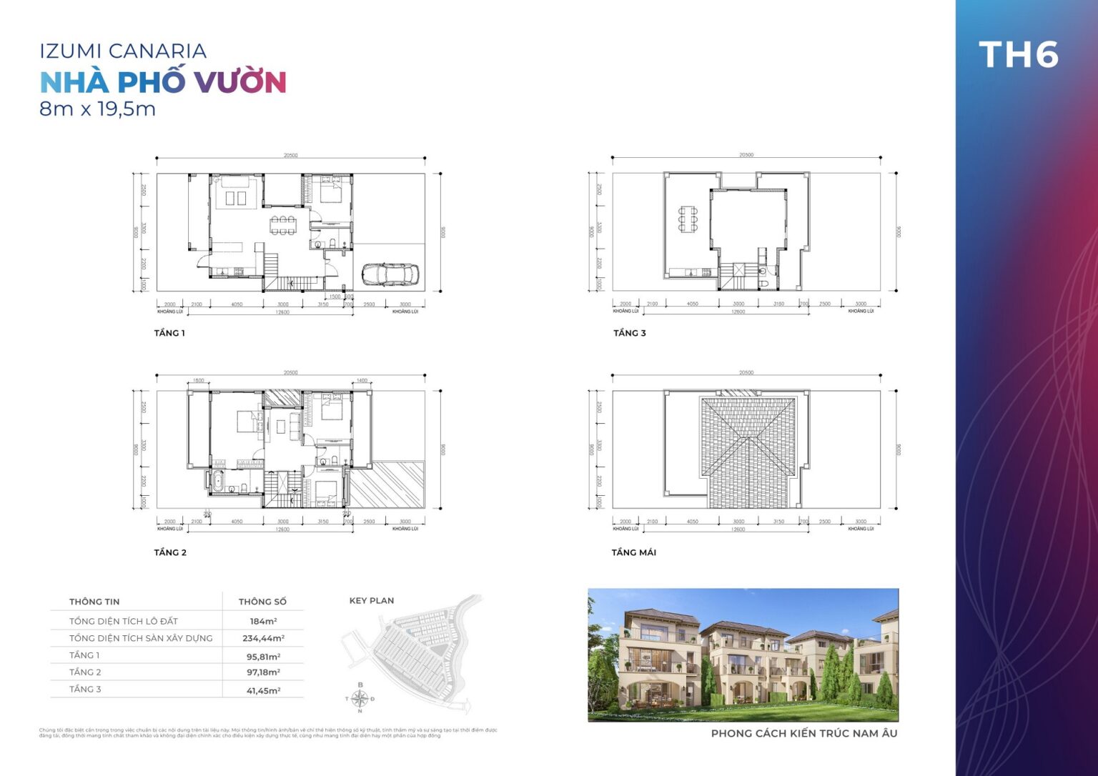 ● Nhà vườn Canaria 8m ngang: 8m x 19,5m, 234 m2 sàn, 3 tầng.